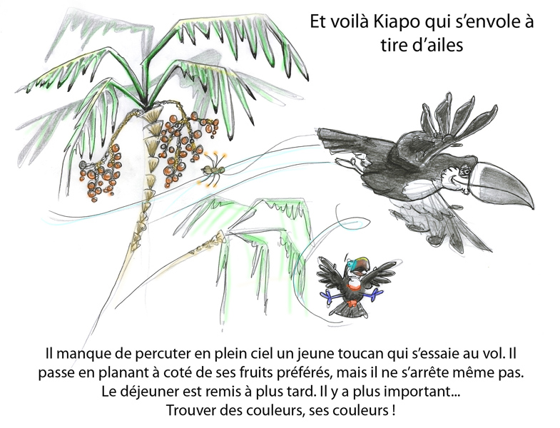 Hors WWF, elle m’a écrit un conte, l’histoire d’un toucan qui part à la recherche de ses couleurs. Le story-board est fini depuis quelques temps déjà, mais la bonne nouvelle est qu’elle a un financeur éventuel pour l’édition des « aventures de Kiapo ».